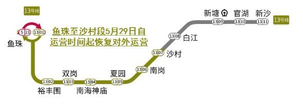 经对线上区间内的设备设施进行全面检查和功能测试,并开展安全评估后,十三号线鱼珠至沙村段自今日(5月29日)运营时间起恢复对外运营服务,行车间隔约9分钟。沙村至新沙段将视抢险进展和安全评估情况再确定恢复运营时间。给大家出行带来不便我们深表歉意,我们将全力以赴力争早日实现全线正常运营。