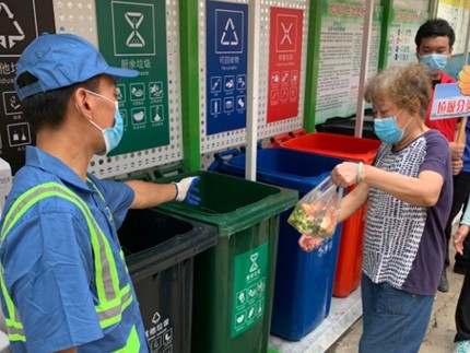 为提升垃圾分类的社会知晓率和居民参与率,目前深圳每天11000余名督导员在分类投放点现场引导居民参与分类投放。