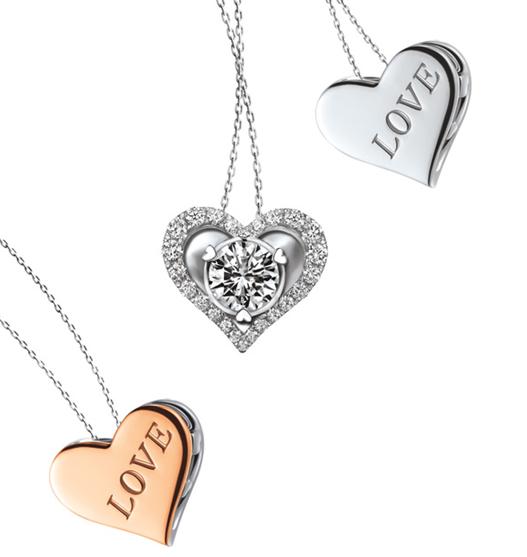 由心而发的幸福,让人散发出与众不同的魅力。在一颗代表爱情蜜语的心环下,悬垂着一颗闪亮的钻石,钻石在多颗心的拥抱下闪耀出迷人的光芒,彷如你在恋人无微不至的爱包围下,每走一步都折射出幸福的光华,成为他眼中永恒的焦点。