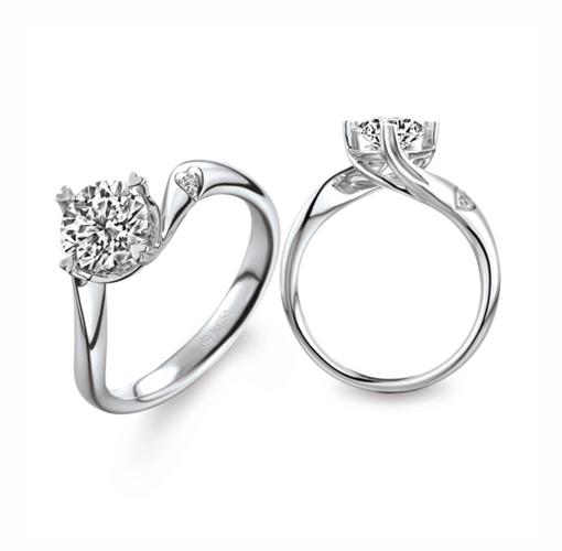 以四颗心形抓住闪烁的钻石,犹如以全心全意的情意捉紧情人的心,时刻向挚爱倾注无穷无尽的爱意;主石旁边小小的心形图案里镶嵌着一颗精致的钻石,犹如时刻守护在挚爱的身旁,默默地付出无限的爱意。