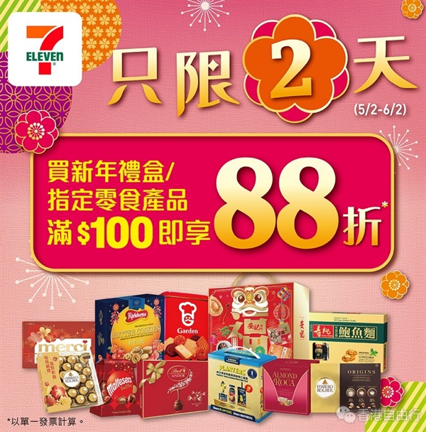 7-11新年礼盒/指定零食88折优惠登场,只限2天,是时候入定年货啦。由即日起至2月6日到7仔买新年礼盒/指定零食产品满$100,即享有88折优惠。