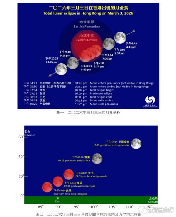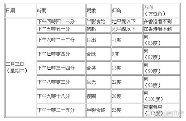 香港上空3月3日(星期二)傍晚将出现月全食。若天气情况许可,市民可以肉眼直接观赏月全食过程,面向东方而没有障碍物的地点都适合观赏这次月食。