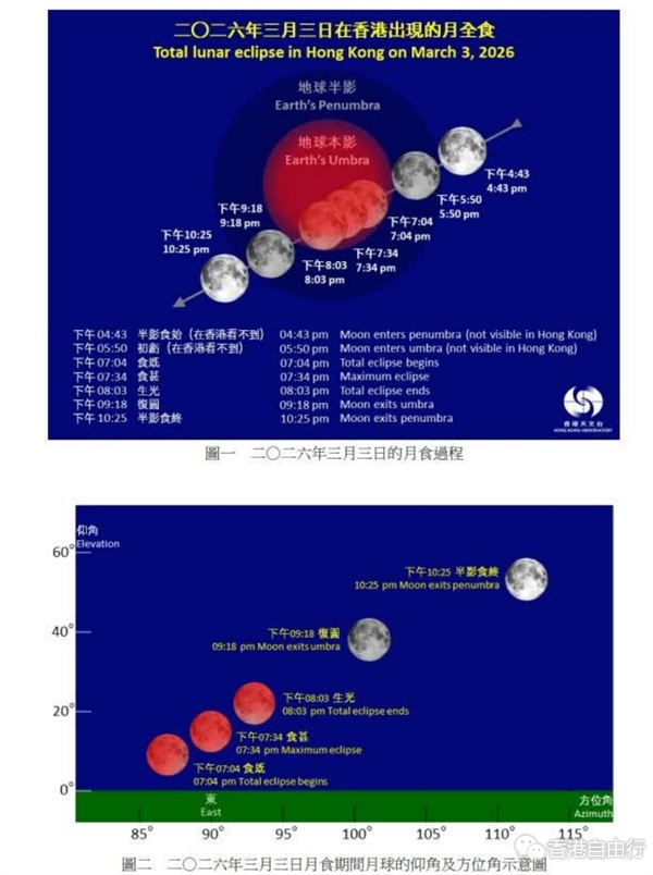 今次月食会在月出前开始,因此月亮会带食而出。今日月出时间为下午6时22分,月出前部分月球已进入地球本影;至下午7时04分,月球将完全进入地球本影,即「食既」,月全食正式开始;「食甚」时间为下午7时34分,届时月球中心和地球影子中心最为接近;至下午8时03分月球开始离开地球本影。