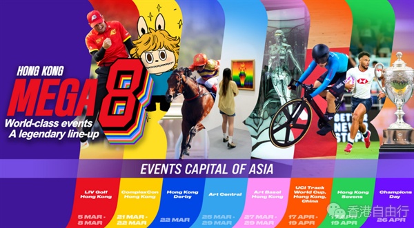 旅发局今年以「Hong Kong Mega 8」为主题,整合3月至4月期间在港举行的八项大型盛事,包括LIV Golf 2026香港站、ComplexCon香港、香港打吡大赛、艺术中环展会2026、巴塞尔艺术展香港、UCI世界盃场地单车赛、国际七人榄球赛和冠军赛马日,展现香港「亚洲盛事之都」的活力(按日期排列)。