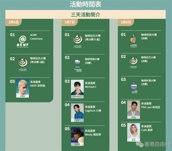 活动汇聚超过30个来自日本、韩国、马来西亚、中国内地、港澳及台湾等国家和地区的顶尖咖啡品牌,带来美食及生活市集,还有音乐舞台、四大专业咖啡竞赛等。