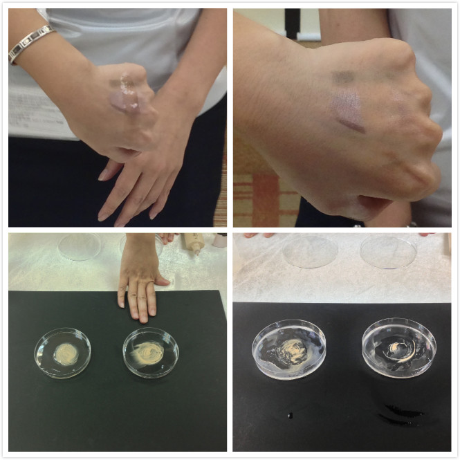 下:右面是用Sofina卸妆油,左边是其他牌子,卸走粉底的效果有明显对比。