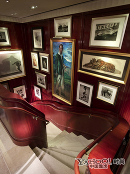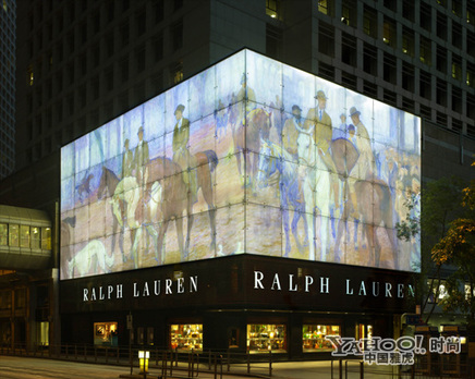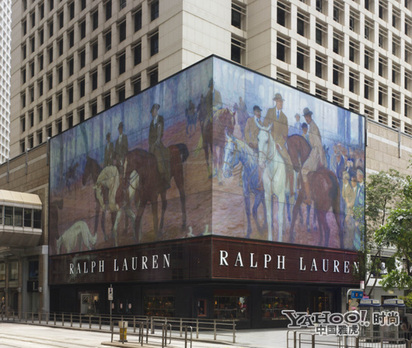 新店的临街面墙跨越五个楼层,专门的设计精巧细致,以背光照明的玻璃拼出著名法国画家Octave Denis Victor Guillonnet的名作Bridle Path at Hyde Park。这幅名画是Ralph Lauren先生的私人珍藏艺术品之一,主题是品牌崇尚的高贵马术传统。室内设计弥漫英国男士俱乐部的氛围和伦敦新邦德街1号专门店的装饰艺术 (Art-Deco) 风格,桃木制品染成黑色并以法式抛光,皮革和石灰石缀饰光面和亮滑镍金属,营造刚阳气息。店内有楼梯贯通三层,这条主轴把Purple Label和Black Label专区连接起来。