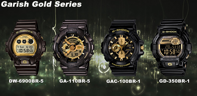 G-SHOCK Garish Gold系列包括DW-6900BR-5、GA-110BR-5、GAC-100BR-1和GD-350BR-1四个表款,用低调的黑色中和奢华的金色,用耀目的金色点缀沉闷的黑色,最终将两种颜色的质感发挥到了极致。