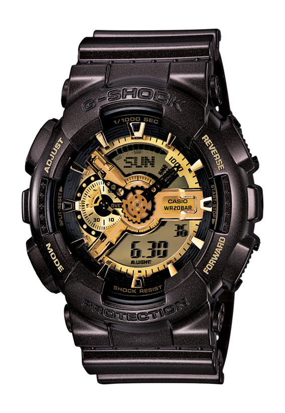 潮流大人气的GA-110挥别多彩的缤纷鲜艳色系,改以深褐色珠光表身搭配耀眼的金色表盘,表面上的时刻刻度以立体金属零件制成,手腕晃动间可见金属光芒闪耀,更加深重机装置造型的指针双显的印象。55mm大表壳尺寸和多层次的设计让暗色系同样跳脱,款式不会困于单一与无聊,时尚人士的最爱选择。