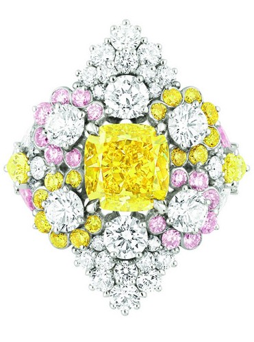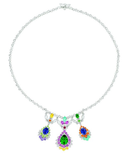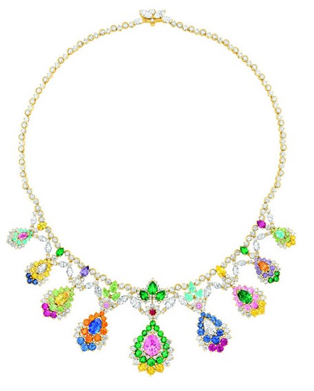 迪奥先生曾说过:“色彩赋予珠宝价值,能让人容光焕发、楚楚动人。一袭黑裙、一件毛衫,再搭上一条闪亮的彩色项链,还有比这更优雅的装扮吗?”迪奥高级珠宝部艺术总监维多利亚•徳卡斯特兰娴熟自如地发挥着那份与迪奥先生相同的对于色彩的独特天赋,各种色彩在她的笔下相互融合、熠熠生辉:红色和蓝色的丝绸布料奇妙地变成了一颗颗红宝石和蓝宝石采用了钻石、锰铝榴石、钙铁榴石、帕拉依巴碧玺、红宝石、祖母绿,更有一整套的彩色蓝宝石,如浅黄色、深黄色、浅蓝色、深紫色,以及各种粉色蓝宝石等,绝妙的宝石运用手法将高超的色彩诠释工艺演绎得惟妙惟肖。镶嵌工艺同样创意十足、手法细腻,充分诠释出维多利娅充盈丰沛的用色手笔,像是渐变色、同色、撞色以及犹如烟花绽放般的炽烈色彩。