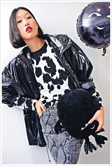 ■乳牛图案针织上衣/$300、黑色PVC胶面外套/$600、蟒蛇纹牛仔裙/售价待定。
