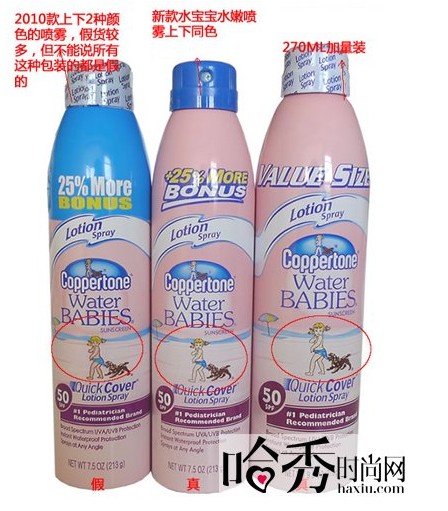 来自美国的水宝宝coppertonoe是一个非常畅销的防晒霜品牌,在美国市场的防晒品市场上有30%以上的占有率,同时它也是美国儿科医生推荐的防晒品牌。它所涉及的产品系列很多,包括大人小孩使用的粉色water babies系列水嫩防晒;也有适合户外运动的防晒系列等。有着新颖大方的包装,价格也非常合理,因此受到众多朋友的追捧。而正因为如此,所以它也惹来了不少山寨商的仿造,大批的假货充斥市场。为了让各位爱漂亮的朋友能够选购到真正有效的产品,哈秀时尚小编为大家精心准备了本期的水宝宝防晒喷雾真假辨别知识讲学,让更多的朋友免受买到假货的困扰,用正牌产品真正让肌肤得到防护。