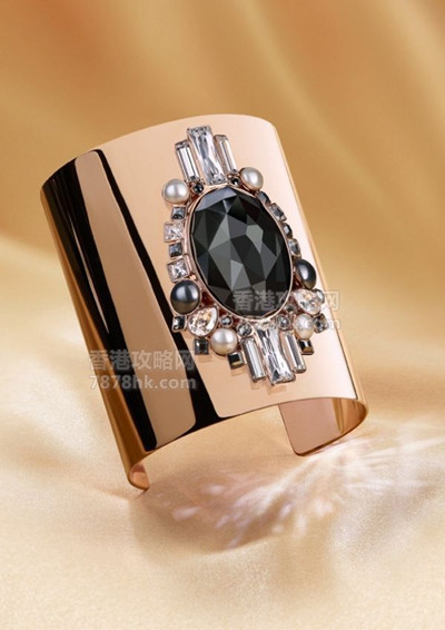 这款镀玫瑰金色的阔手镯,中央缀有一颗特大的椭圆形切割Swarovski 水晶,并饰有长方形和梨形切割水晶,贵气并适合日装配戴。 $3,500
