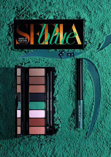 品牌秋冬的「Blue Sepia Collection」以独特的蓝绿色(Petrol Blue),带著沉郁的灰调,推出8色眼影眉妆盘,眼影质感丝滑,以5种不同的哑色啡调色彩以及闪烁浅粉色掀开序幕,配合闪烁蓝调Petrol Blue及珠光铜啡色,互相搭配缔造出丰富层次的眼妆。