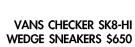 内增高的鞋款热潮於近几年就像没有停过下来,就连以街头「板仔」造型为特色的VANS,也要一尝「增高」乐趣。最新推出的WEDGE系列,是SK8-HI型号的专属进化版,一共4款,包括女人味的豹纹拼黑色、经典抢眼的红白格仔以及型格时尚的纯黑色,再加上鞋侧同样有SIDESTRIPE标记细节,吸引力可是没法挡!虽说内里的鞋垫高度为7CM,但穿下却没有穿着高跟鞋的压力,带来不同的穿着体验和搭配感觉之余又有修长美腿效果。时至今日代表性的SK8-Hi鞋款仍深受滑板玩家、乐队、艺术家和街头文化人士的推崇,不知能令双脚显瘦的WEDGE,反应又会如何?