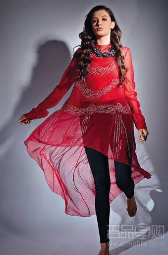 3. 红色背心/$99、珠片刺绣图案红色雪纺连身裙/售价待定、银色闪石项链/$349、黑色刺绣长裤/$399。