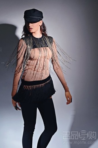 1. 啡色针织上衣/$299、金属串珠流穗颈饰/$799、流穗腰带/$499、黑色刺绣贴身长裤/$399。