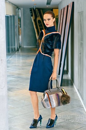 ◆军蓝色连身裙拼黑色橙边短袖皮草小外套($114,200)、Multi-colour Pequin Mink Adele手袋($111,700)、Monster皮草吊饰($5,700)、缀皮草紫色牛皮高跟鞋($21,800)。