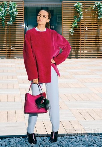 ◆桃红色羊毛拼?皮外套($95,200)、白色上衣($14,000)、白色长裤($6,900)、桃红色羊毛 Anna手袋($29,200)、Monster皮草吊饰($5,700)、黑色漆皮缀皮草高跟鞋($20,000)。