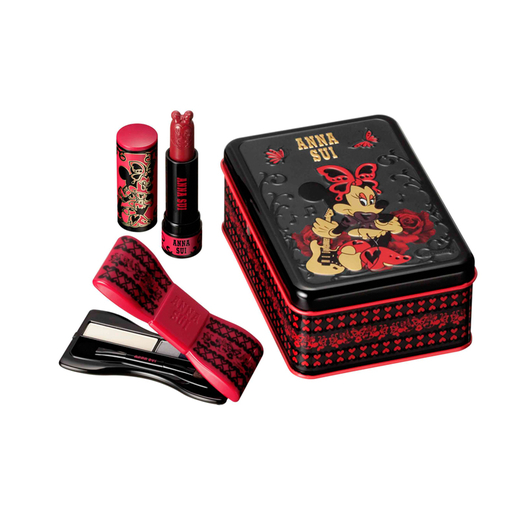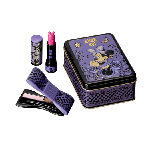ANNA SUI 米妮圣诞限定彩妆礼盒具摇滚及浪漫两种风格的色调,造型可爱的大蝴蝶结内附闪烁娇媚眼影,轻易塑造以银色為主的冷艳魅力及棕色系的梦幻深情两种眼妆,同时蕴含玫瑰果籽油為眼部肌肤保湿。唇妆方面,蔷薇唇膏色泽柔滑鲜艳,亦能软化唇部肌肤和保湿,展现透亮诱人樱唇。