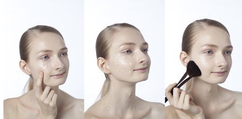 用指腹上妆,由脸部中间开始,以按压的方式,均匀向外推开。