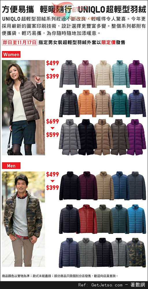 UNIQLO(优衣库)指定男女装超轻型羽绒限定价$399香港优惠