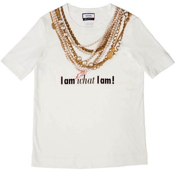 棉质 T 恤配上经典金句「I am still what I am」印花以及特别为本系列而设计的trompe l’oeil effect 锁链印花