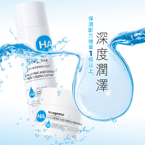 台湾玻尿酸达人Neogence玻尿酸保湿系列,针对乾性以至极乾性肌肤,推出全新玻尿酸深度润泽化妆水及玻尿酸深度润泽霜,重点以两大步骤-先补水、再锁水,大幅提升肌肤底层的水分,并修护皮脂膜及细胞间脂质,让水分不易流失。