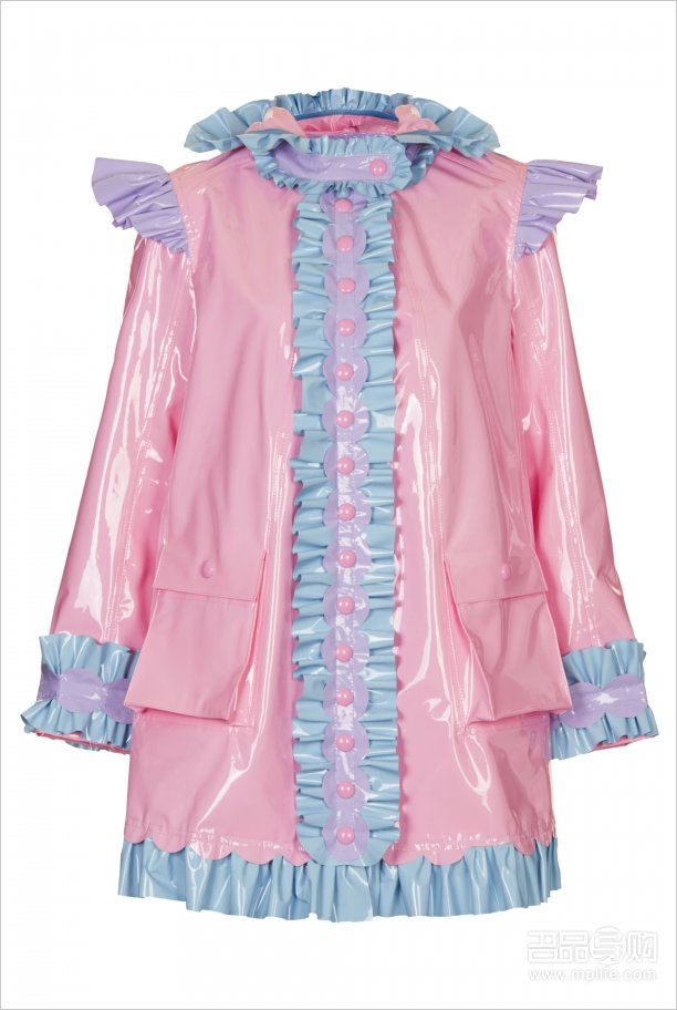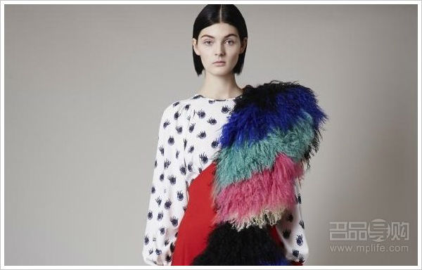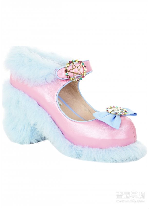系列采用了截然不同的物料;包括皮革、蕾丝、麂皮、雪纺、针织、闪粉、Mongolian Shearling、PVC和兔毛,颜色则使用比较鲜艳的色彩及采用如洋娃娃上的淡粉红色、黄色及蓝色,营造出撞色的效果。