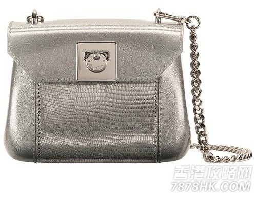 迷你Candy Bag闪耀银色版:细小灵巧的肩背手袋,银色PVC加蜥蜴皮纹皮革,配上细长银链肩带,如一瓣雪花宝石点缀亮丽造型。