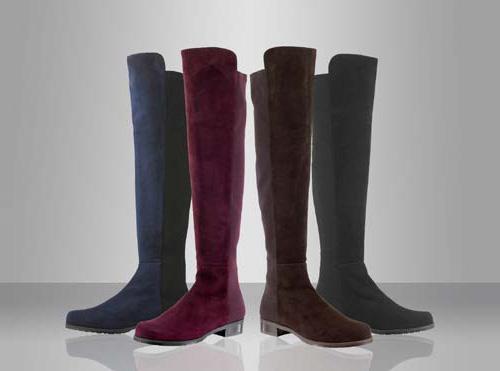 这款靴子由高档小牛皮和丝绒革拼接而成,靴子小腿部分采用了 Stuart Weitzman 的标志性拉长面设计让双腿的线条更加细长。长靴既能搭简单的牛仔裤也很适合一件一年四季都能穿的短裙。颜色有经典的黑色小牛皮或麂皮、棕色麂皮、波尔多红酒色或海军蓝麂皮。