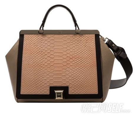 新款CANDY BAG 手提包绝对教人难以抗拒!设计选用蛇纹小牛皮 袋身配衬saffiano 小牛皮革翻式袋面及金属饰扣,并巧以粉亮色彩映衬深咔色调。其半透明的塑料袋身与天然的皮革底部相映成趣。