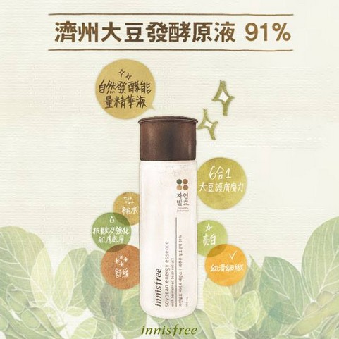 韩国热宠护肤品牌 Innisfree 一直专注于以天然力量修护肌肤,故取材大豆异黄酮特别多的济州大豆、火山泥及济州天然泉水等,精心钻研发酵原液的美容护肤成份,研发出「Innisfree 自然发酵能量」护肤系列,将大豆所含的营养成分结合大自然能量,传送至疲惫倦怠的细胞,让肌肤重拾光采亮白。