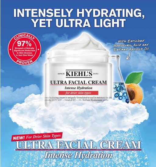 kiehl’s產品研发专家多年来以尖端保湿科技著称,继经典杰作Ultra Facial Cream (特效保湿乳霜)全球热卖后,品牌再下一城,研製出全新保湿產品-Ultra Facial Cream Intense Hydration (深层滋润保湿乳霜)。Kiehl's利用全新配方,摒弃一般厚重润肤成份,如:蜡质或油质,保证不会对肌肤造成负担,并能於24小时内提升保湿滋润功效,令肤质柔滑可人。