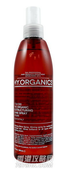 来自意大利的天然护发品牌MY.ORGANICS,产品均以草本植物精华及天然精华油所制成。绝对不含DEA(二乙醇胺)、 SLS(烷基硫酸盐)、羟基苯甲酸盐(化学防腐剂)及石化物质,而且更具有治疗特性,其香气、颜色都以完全天然的方式来制造,用后能改善痕痒、脱皮的情况,令头发回复健康及有光泽。