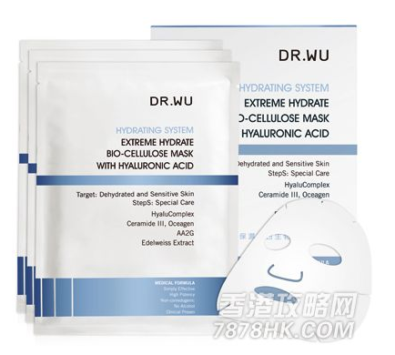 DR WU Extreme Hydrate Bio-Cellulose Mask with Hyaluronic Acid $320/3 pcs 使用新一代0.3mm 微纳米生物纤维制造的面膜,超薄的质地,可紧贴面部每吋肌肤。蕴含高达四倍保湿瞬白再升级精华,可达至外层锁水、内层补水、肌底造水三重功效。