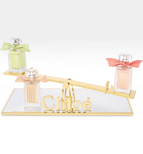 三款my little chloés小小蔲依香氛在金色翘翘板上悠然展示,趣致而轻盈。
