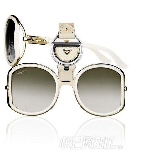 Ferragamo Buckle系列 依照搭扣(Buckle)的造型对太阳镜的正面进行重新设计,将对细节的专注变成产品的一大标志。系列以高科技板材与金属打造,是创造性、功能性与尖端技术的完美结合:从高科技板材镜框,金属外框,到以一整块金属制成的时尚铰链与镜腿及右侧镜片上用激光雕刻的Ferragamo标识。有四款时尚配色可供选择——黑色与金色款、浅雪茄色与金色款、深雪茄色与金色款、象牙白与金色款。