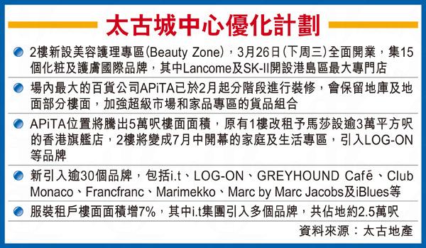 太古城中心斥资1亿元进行优化工程及商户重组,APiTA 大缩水以外,将引进逾 30 个新商户如 i.t、LOG-ON 等,并打造家庭生活及美容护理两大专区力吸中产家庭客。