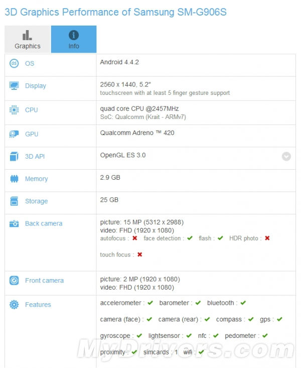其实跑分网站,GFXBench上早已经出现过SM-G906S的配置情况,其配备了1440×2560分辨率屏,大小为5.2寸,搭载了2.5GHz高通骁龙805四核处理器,提供1600万像素后置摄像头。
