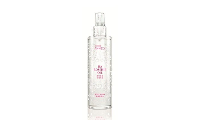 ANNECY全新升级版西班牙有机玫瑰果油Body Water,不但含有高效保湿的透明质酸,更糅合西班牙天然有机玫瑰果油成分和三种草本美白成分,美白淡印,令全身上下肌肤都进一步白滑水润,喷一喷就可以解决皮肤乾燥、暗哑问题,打造完美肌肤!