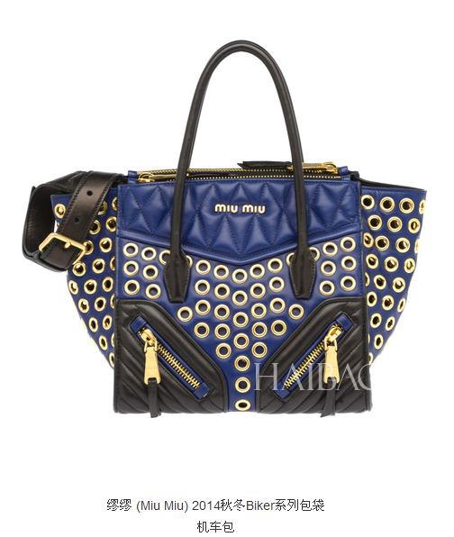 缪缪 (Miu Miu) 2014秋季机车包系列不仅保留了经典黑色款,还增加了白色、蓝色和黄色等明亮色彩,一颗颗蓝色水钻将帆布包面点缀得熠熠生辉。