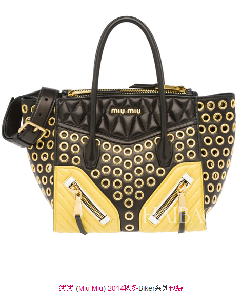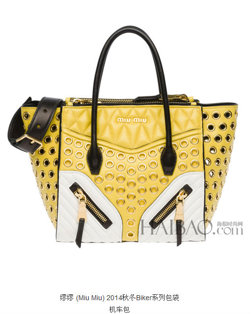 缪缪 (Miu Miu) 从皮夹克获取灵感,发布2014秋季机车包系列。包包融入皮衣的不同细节,还有移动肩带和金色拉链等功能性细节。在经典黑色款的基础上,新款包包增加了白色、蓝色和黄色等明亮色彩。皮革包面的对称拉锁设计同手提带一起组合成“鬼娃娃”的笑脸。缪缪 (Miu Miu) 2014秋季机车包系列可在缪缪 (Miu Miu) 实体店和官网购买。