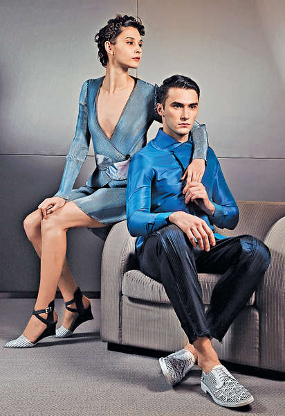 女:灰蓝色条纹单粒钮外套 $6,900、灰蓝色条纹百慕达短裤 $3,400、印花腰带 $2,900、密头凉鞋 $5,800;男:金属蓝色恤衫 $4,900、黑色前幅压密褶西裤 $4,400、白色通孔皮鞋 $6,800