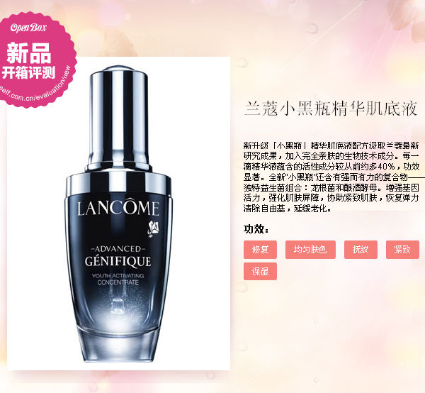 评测总结:兰蔻新精华肌底液含专利复合物:龙根菌+酿酒酵母,日夜深度修护并激发肌肤的年轻光彩。按压式的滴管设计不仅保证产品卫生并且能够很好的控制取用量,使用上也是十分方便;半透明的蛋清质地,吸收非常快并散发出淡淡的花香,肌肤能够瞬间被滋润;质地温和,敏感肌肤也可以放心使用,高效的补水滋润能力伴随着清爽的使用感,完全不油腻,油性肌肤也不用担心会对皮肤产生负担,可以放心使用。无论是对肌肤的细纹修复度、平整细腻肤质的能力还是均匀透亮肤色、提拉紧致轮廓等效果都非常出众。不仅可以看得到肌肤的变化,用手指触摸的触感更加真实,使用后可以明显触摸到肌肤变得细腻滑嫩,水润Q弹,肌肤变得更加紧实,彷如婴儿般的如初好肤质,忍不住要触摸脸庞。肤质的改变让人惊喜,小黑瓶从肌底使肌肤焕然一新。