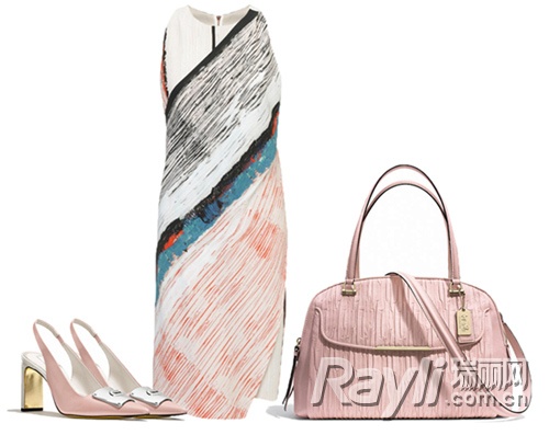 细密的彩色手绘斜条纹具有素描图稿一般的生动流畅,晕染其中的水墨条带更是为连衣裙增添了艺术气息。与裙子上的橘粉色相呼应的,是COACH全新MADISON 麦迪逊系列皱褶皮革 GEORGIE 手提包,巧妙的捏褶皮革形成看似随意实则规律的条纹变种,让轮廓规矩的手袋立刻呈现活泼跳跃的感觉。足尖的SLOAN 高跟鞋的抛光小牛皮的材质呈现出迷人的光泽,贯穿全身的甜美粉色调尽显典雅迷人的魅力。