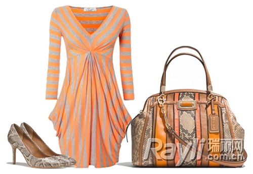 明艳的橘黄、华丽的蛇纹,单说这其中任一一种元素都足够抢眼。而棕、灰色调的加入却能让它们的组合活泼而不轻佻,艳丽而不刺眼。放射性条纹在视觉上会有放大的效果,适合身材娇小的女性选择。橘灰配色前卫大胆,夺人眼球。更加令女性自信爆表的,恐怕还要数全新的COACH MADISON 麦迪逊系列拼缀稀有皮革条纹圆顶手提包,橘色条纹与卡其色蛇纹皮革巧妙拼接,手绘质感的边框线条更是生动别致。如此具有视觉冲击力的搭配再以一双蛇皮高跟鞋收尾,真是活力逼人,奢华至极。