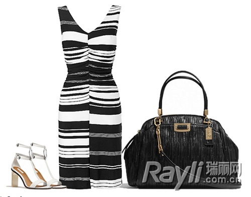作为条纹中的典范,经典的黑白配色条纹是永远不会出错的选择。然而,走在潮流尖端的人可不会选择中规中矩的黑白条纹,从不规则的宽度到不对称的拼接,这条Phase Eight的连衣裙尽显先锋姿态。同样的具有创造力的条纹元素也存在于MADISON 麦迪逊系列皱褶皮革圆顶手提包上,看似普通的黑色皮革因为细密的捏褶工艺而形成的条状纹理显得颇具质感,搭配一双白色高跟鞋,让色彩分布更均匀。