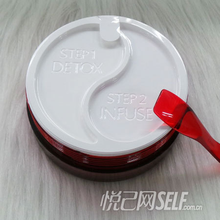 评测结果:石榴红的包装大气优雅,玻璃瓶十分有重量感,瓶口附有白色的隔膜,上面标示了使用的步骤,清晰明了并保证了产品的卫生。瓶内装有两种不同质地与功效的面膜,并且附有一个红色的挑棒,防止用手取用时污染膏体。