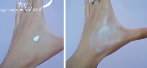 取适量到手背首先来看看质地,白色的乳液状的质地,几乎没有什么味道,没味道说明没有添加什么香料,最近我喜欢无添加的护肤品,无添加就会低刺激。轻轻推动防晒霜的延伸性很是不错的,吸收后的肌肤没有变的很白接近肤色,防晒霜贴附感还是不错的,有修正肌肤色泽的功效奥。